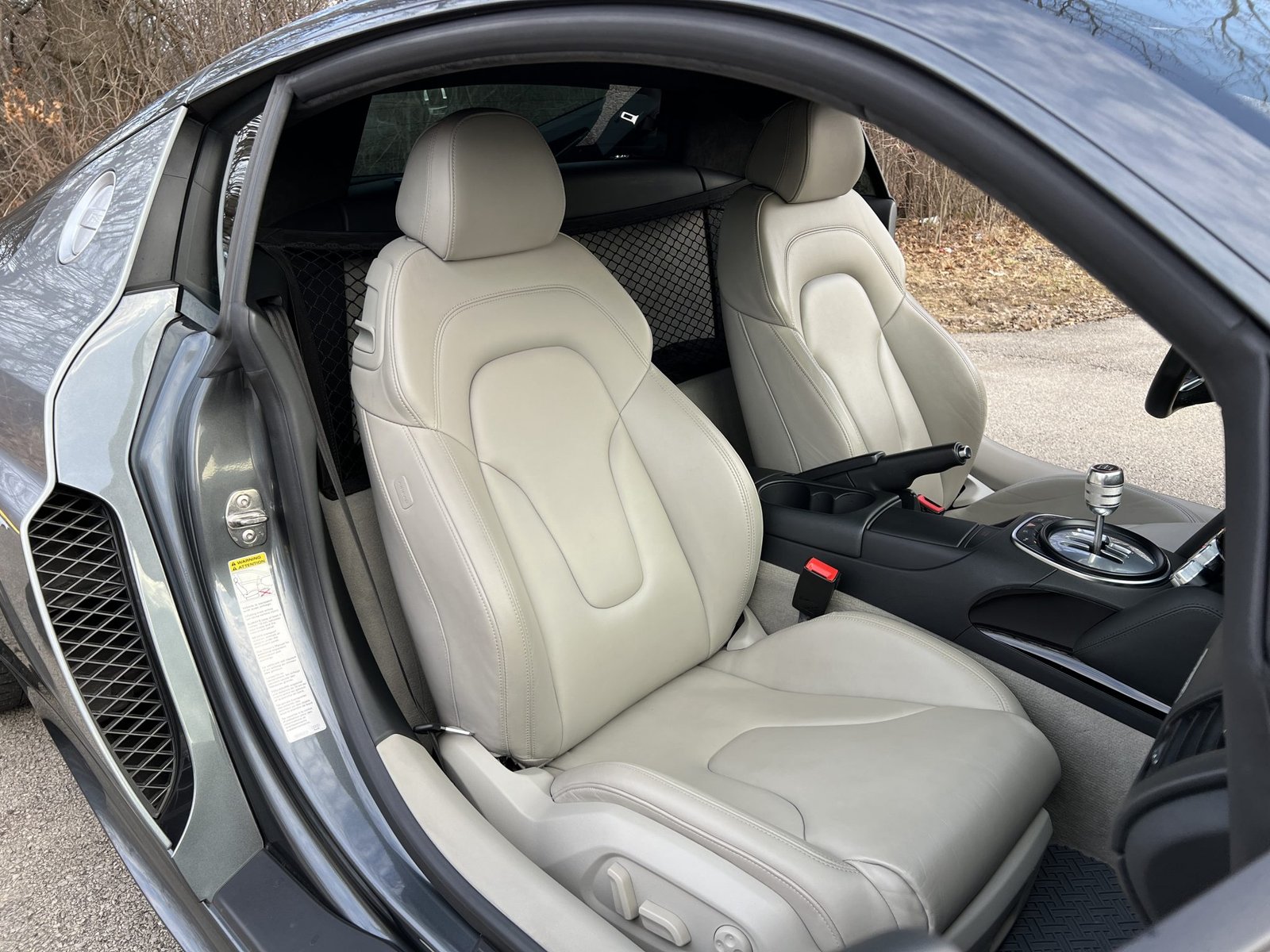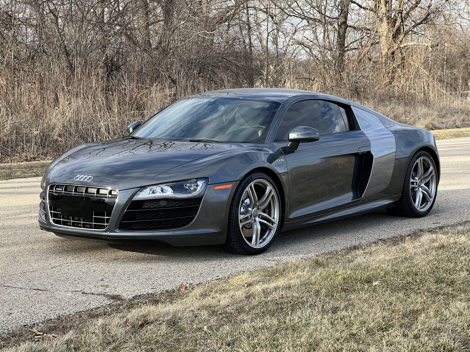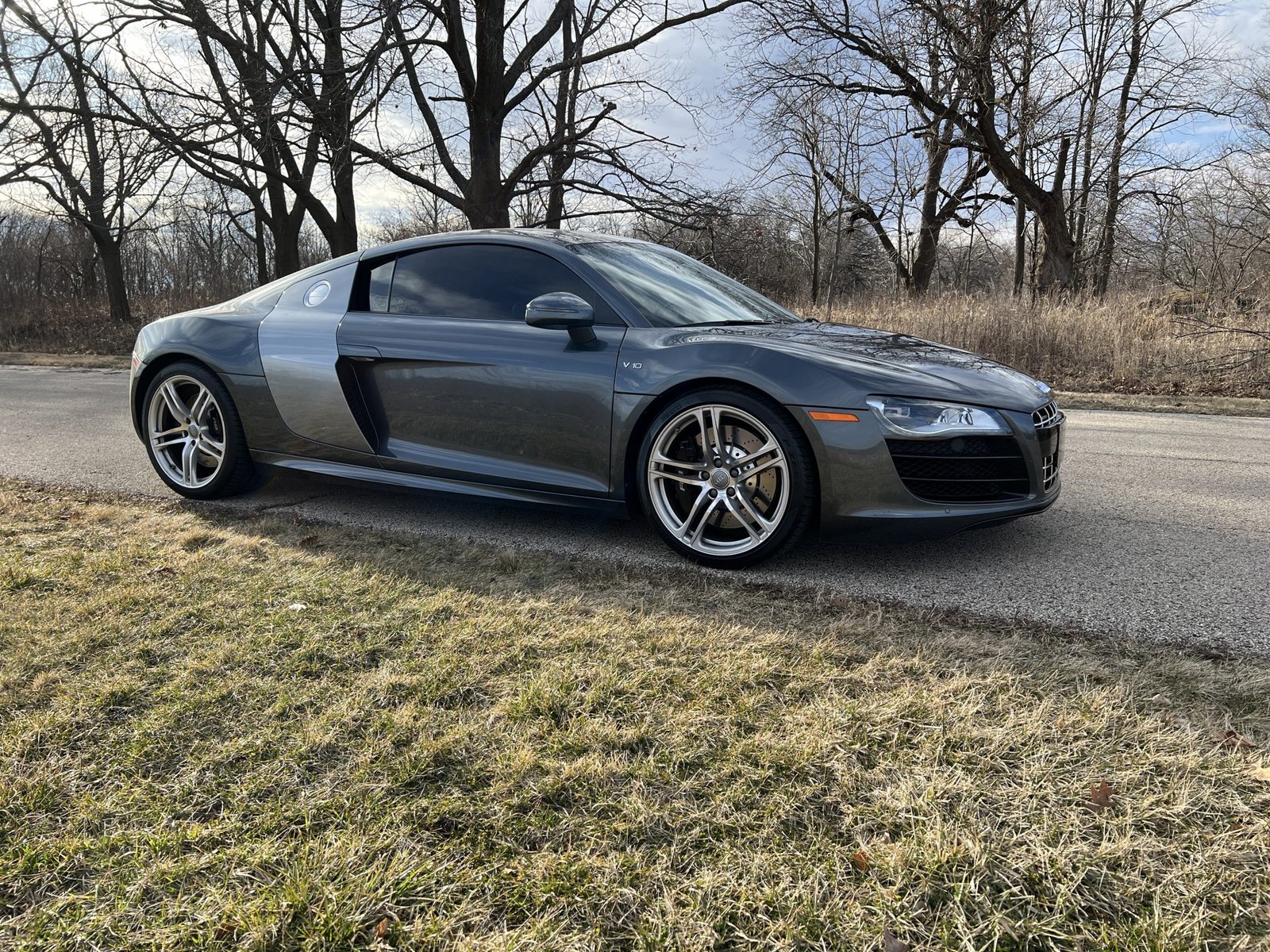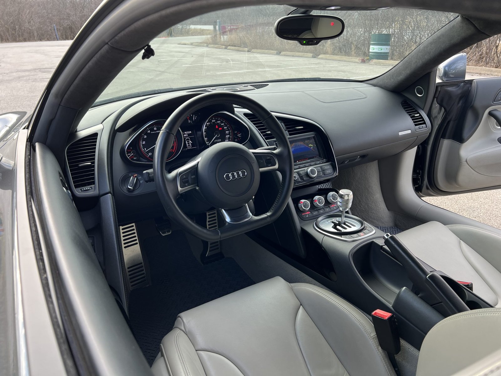 This impeccable 2010 Audi R8 coupe, boasting a clean accident history and exceptional reliability, is propelled by a potent 5.2-liter FSI V10 engine, delivering exhilarating performance to all four wheels through a precise six-speed manual transaxle. Dressed in an elegant Daytona Gray Pearl exterior finish complemented by Apollo Silver side blades, this R8 exudes sophistication and style.